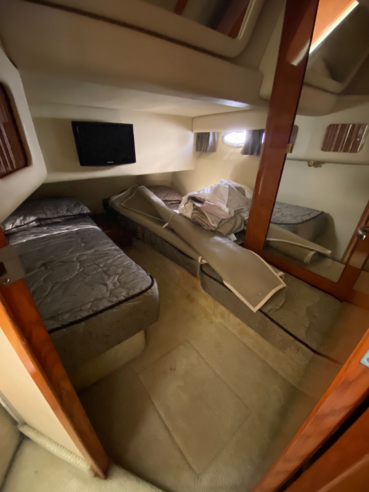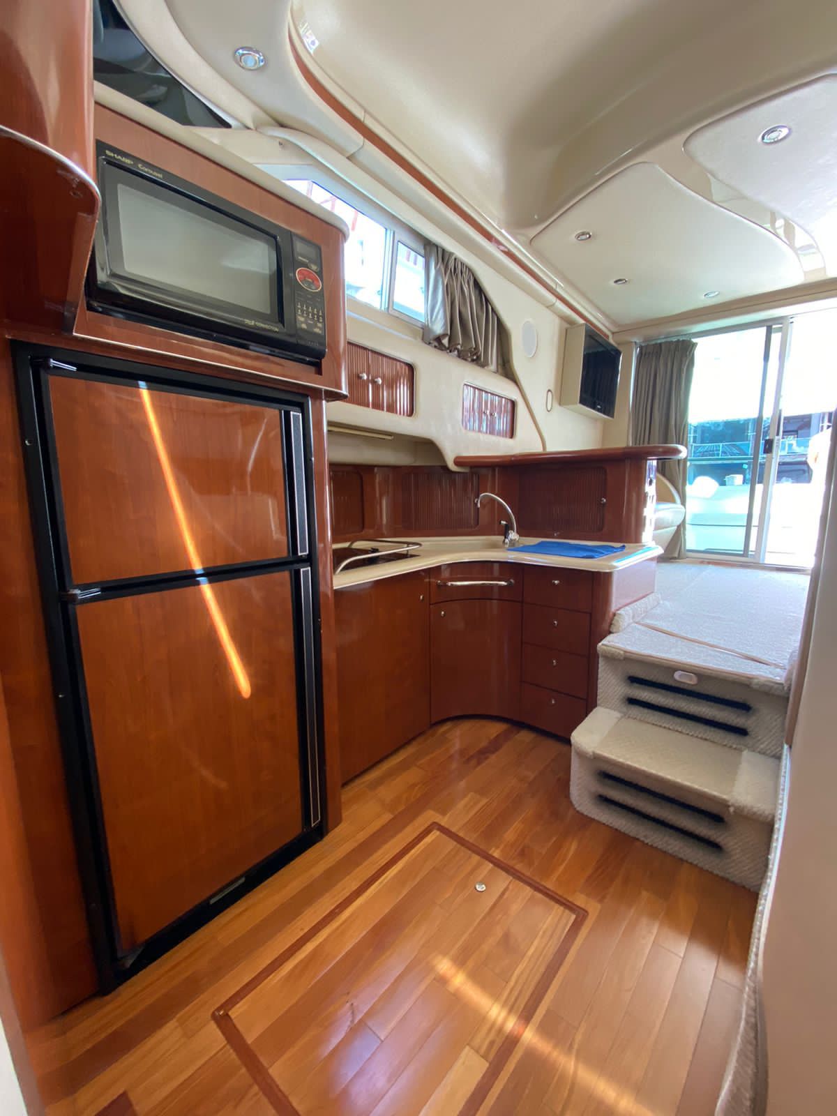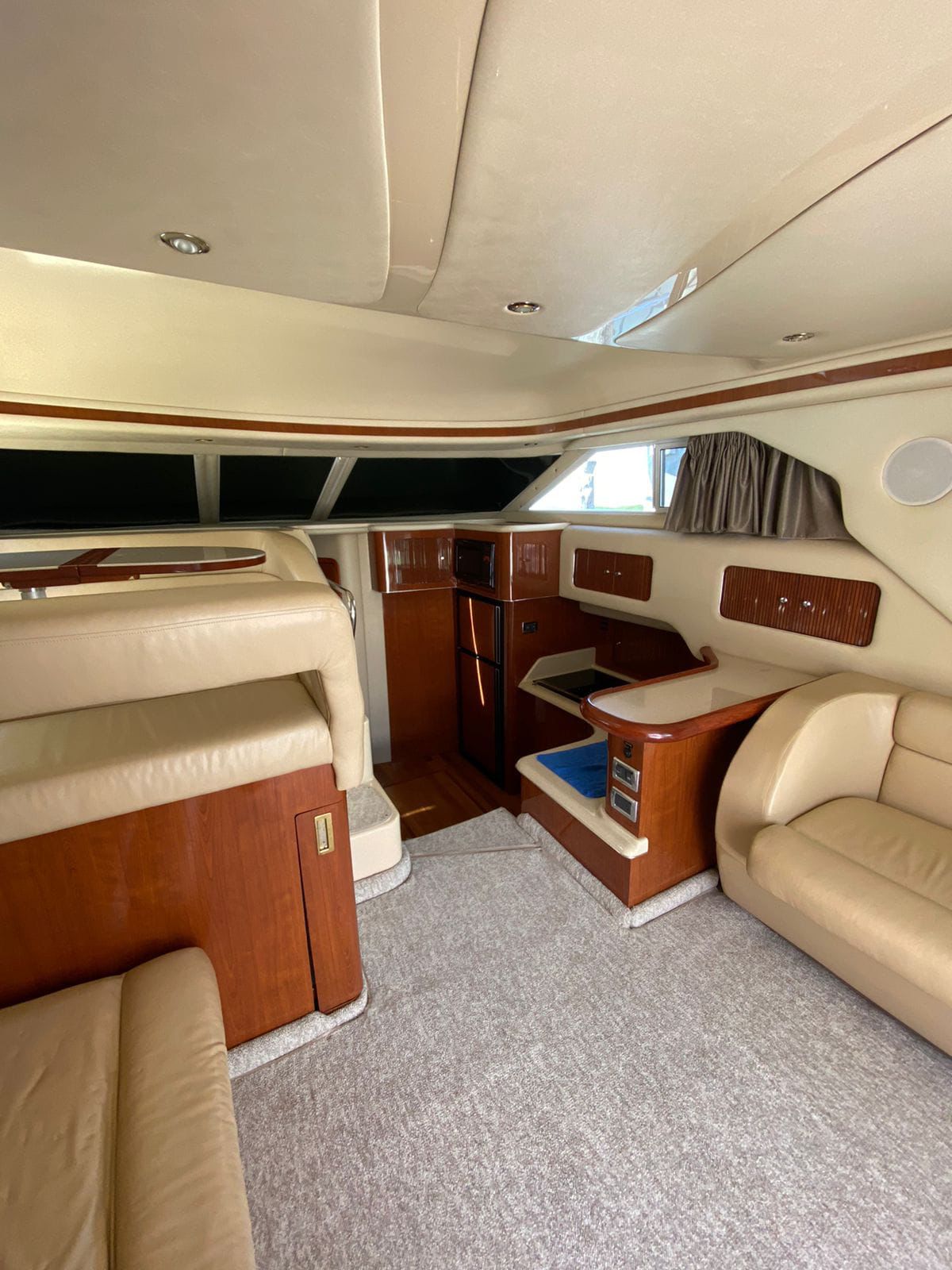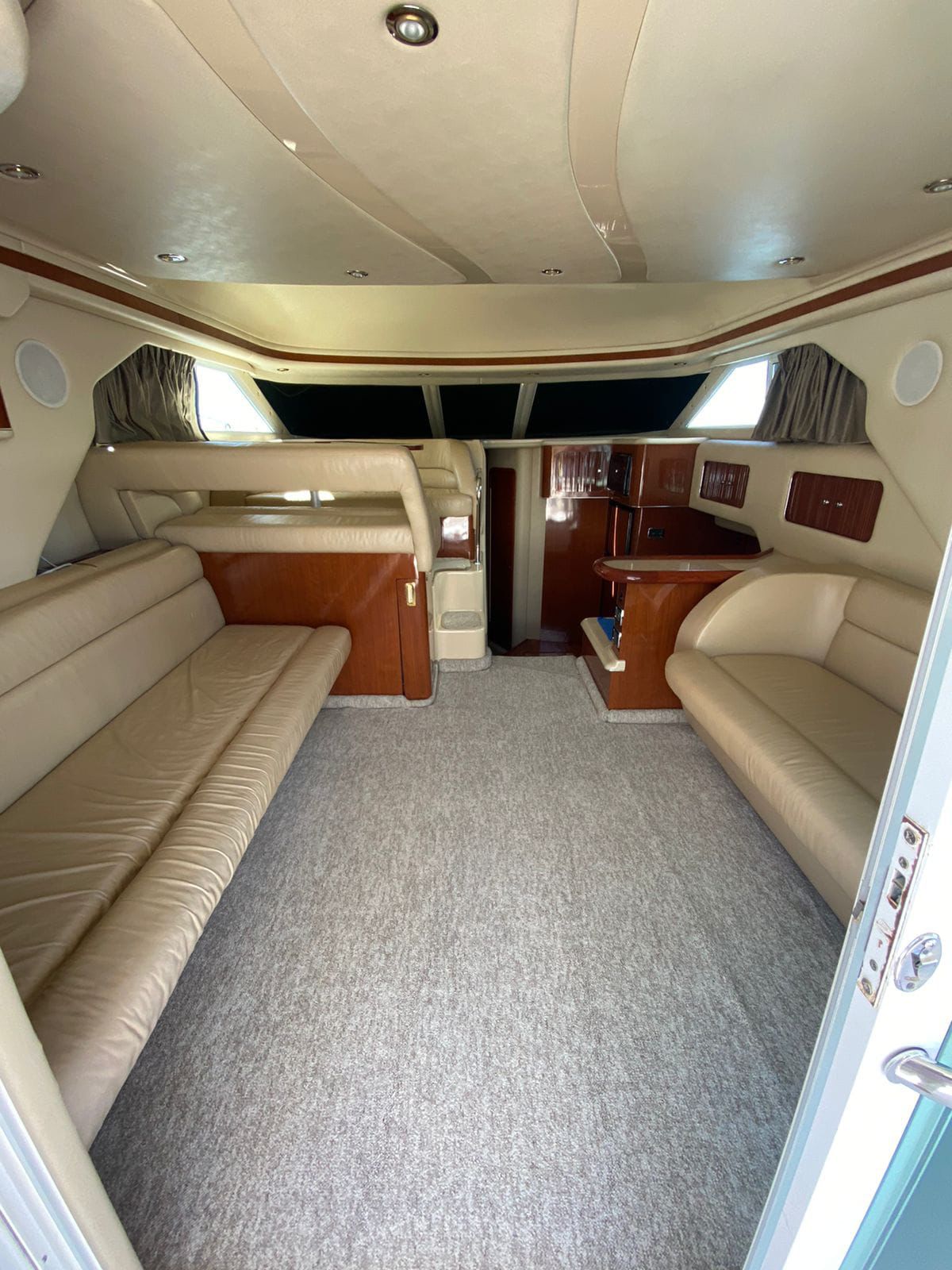 En la parte inferior se encuentra una cabina de gran tamaño con 2 filas de asientos con mesa, una habitación con cama, una Plasma y una pequeña cocina. También se encuentra un baño con lavamanos.