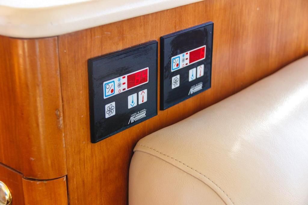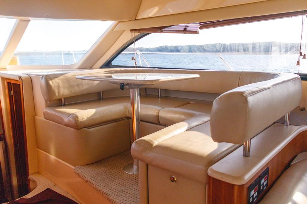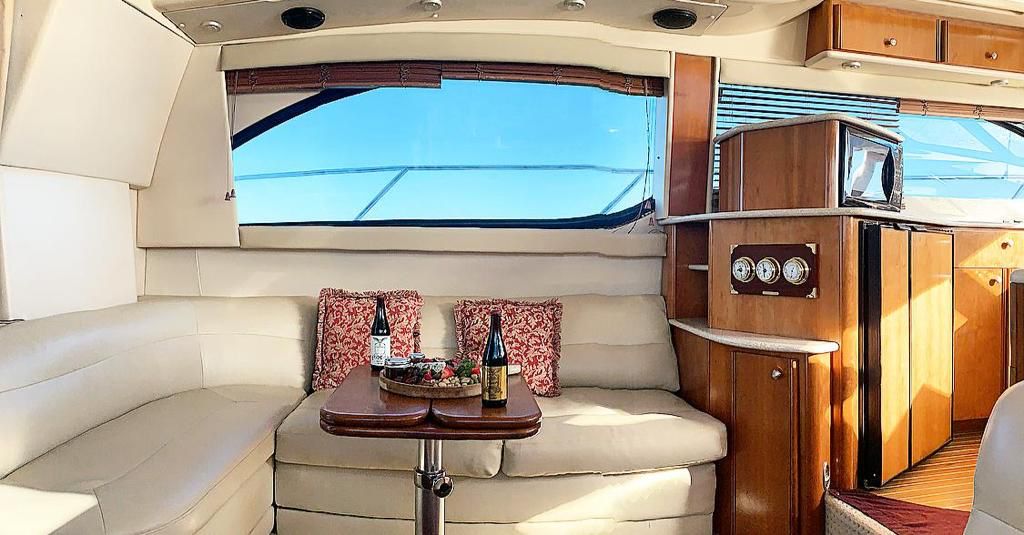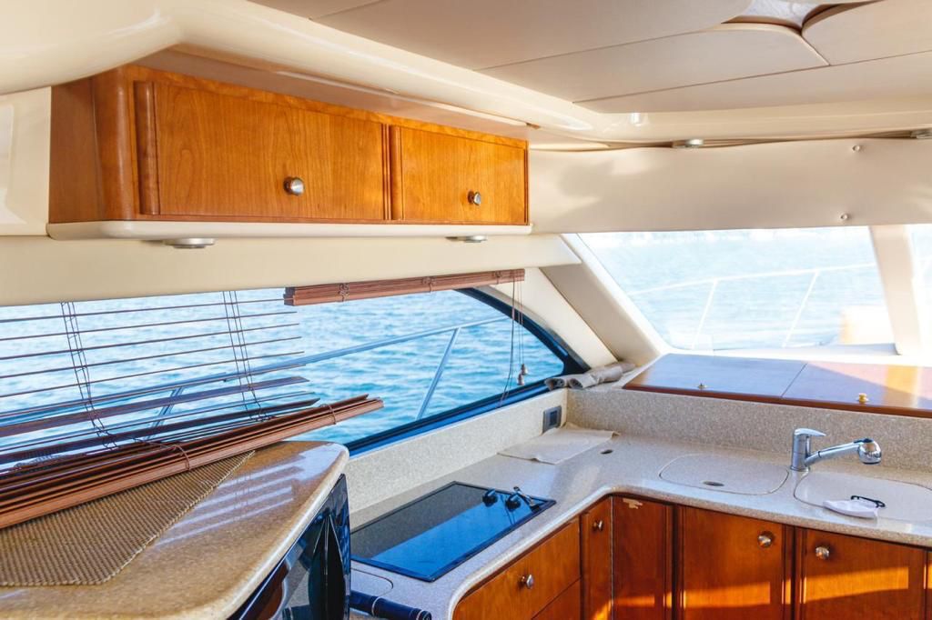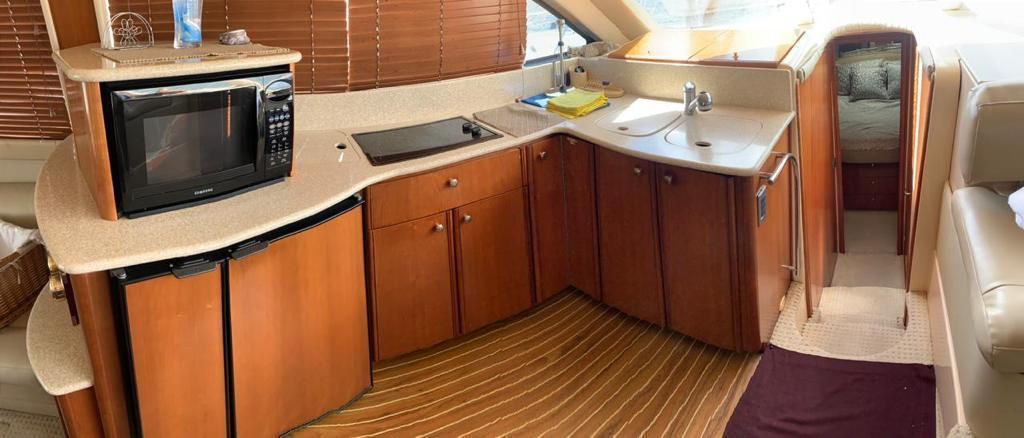 The 45ft. Meridian yacht opts for more spaciousness inside with a large living room with comfortable seating, equipped with a television, a dining room, and a spacious kitchen, in addition to its cabin and bathroom. On the outside, it has ample space aft for dancing and enjoying the great sound it offers, as well as its flybridge where you can climb and enjoy a spectacular 360-degree view of the ocean, equipped with mattresses and chairs to be completely comfortable.