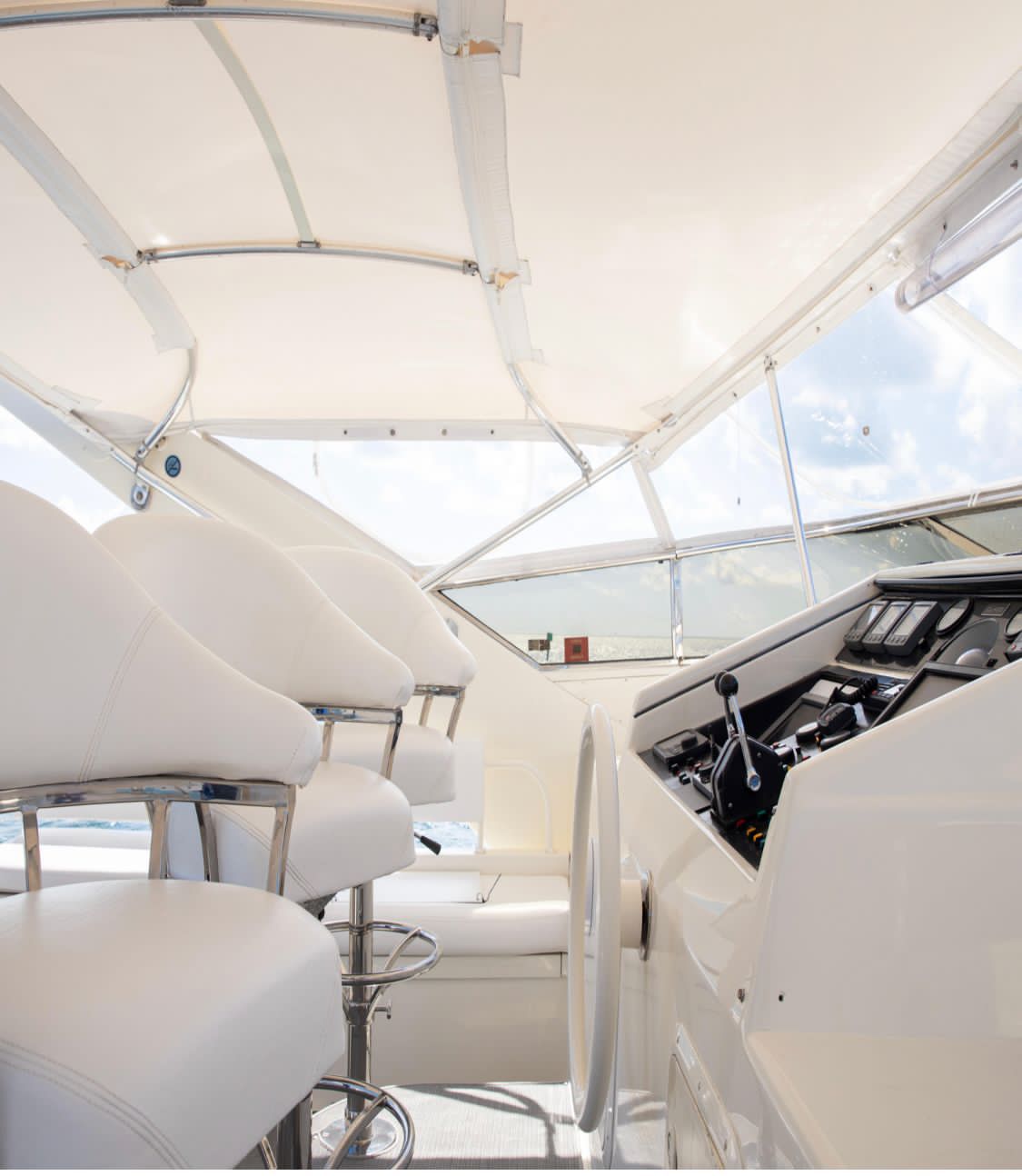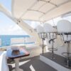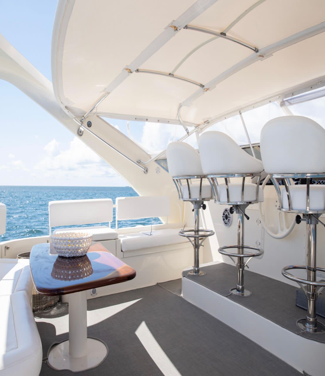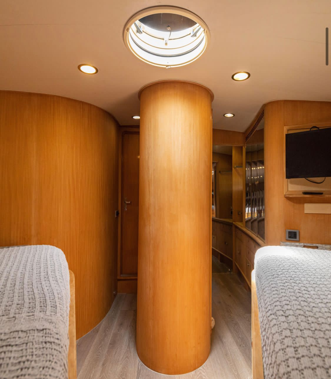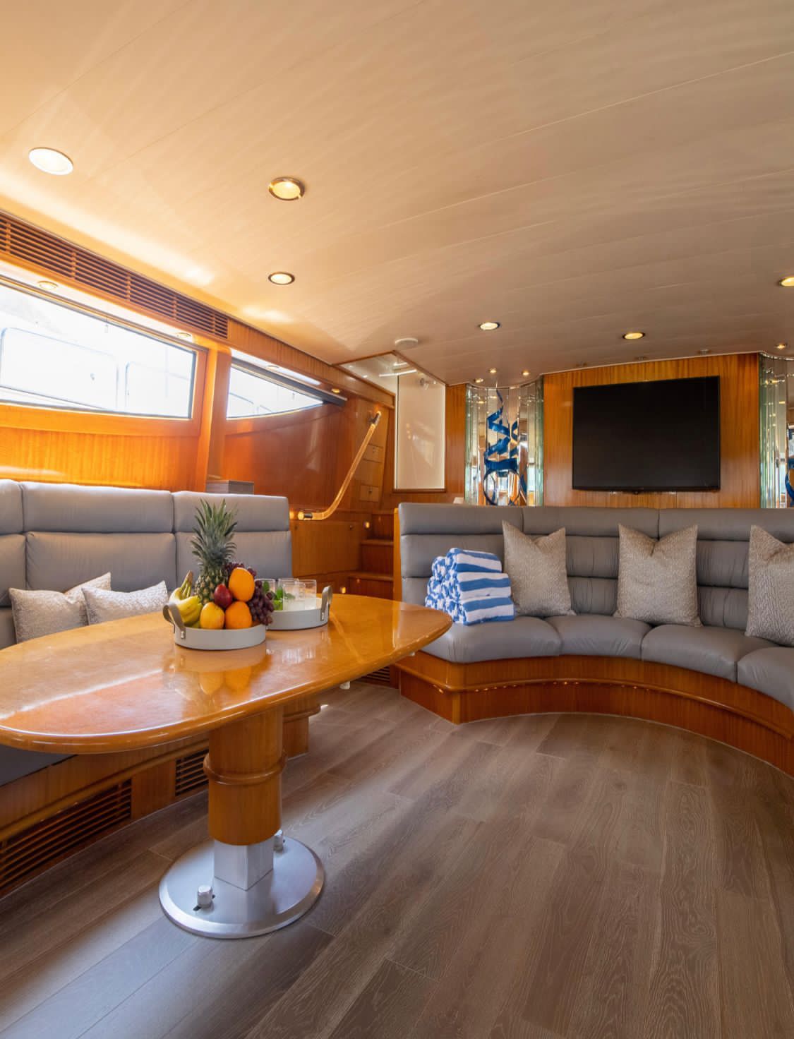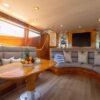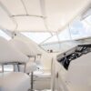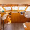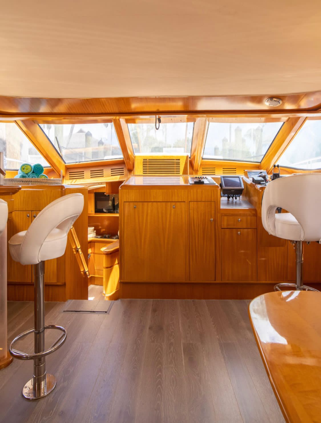 It has a unique and large salon that can be used for all kinds of entertainment, including a complete bar with bar seats, a curved 52” TV, a JL sound system, large curved sofas, and space that can be used as a dance floor. The aft/superior helm has a table for 6 people, an auxiliary port, and starboard seating