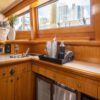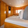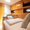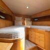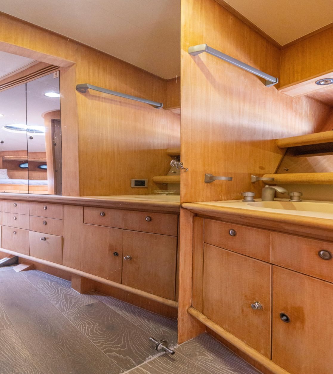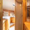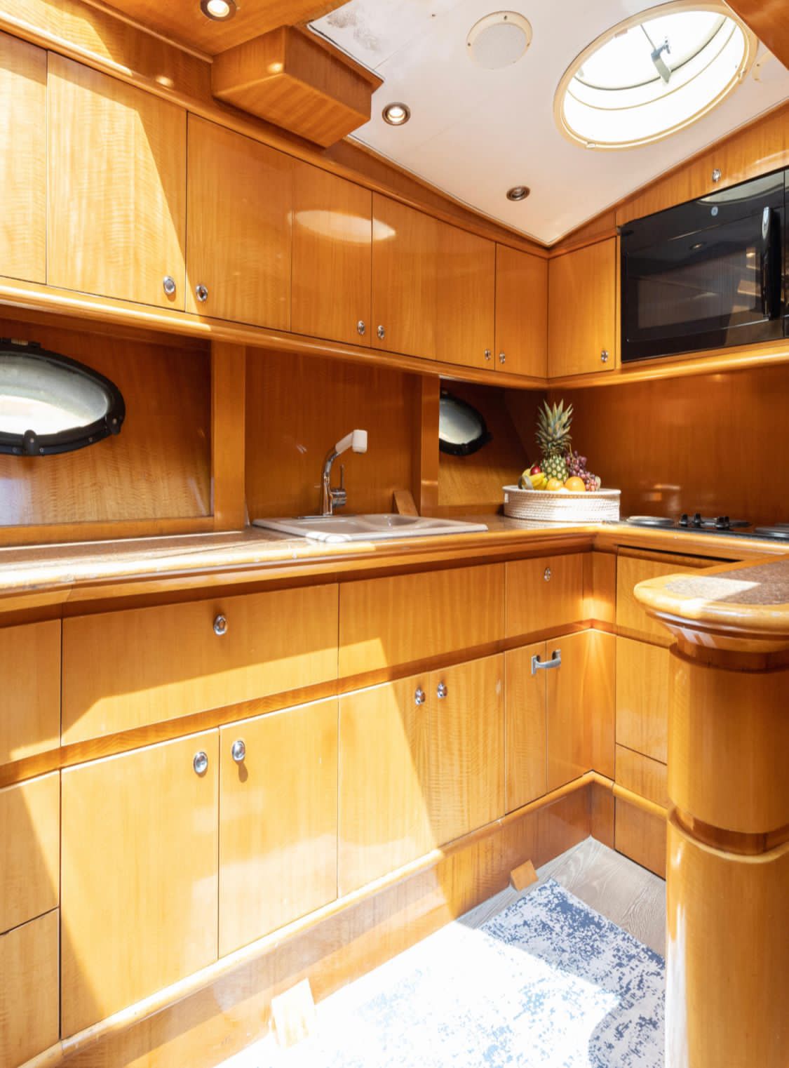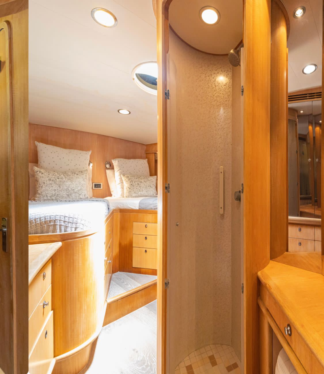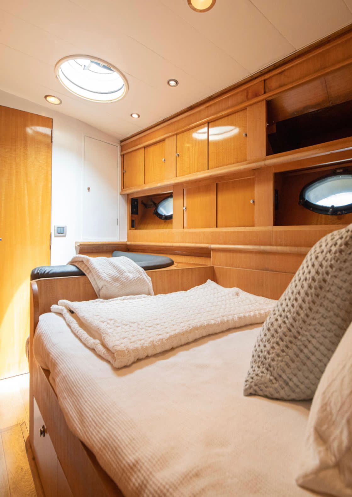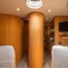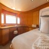 It has a unique and large salon that can be used for all kinds of entertainment, including a complete bar with bar seats, a curved 52” TV, a JL sound system, large curved sofas, and space that can be used as a dance floor. The aft/superior helm has a table for 6 people, an auxiliary port, and starboard seating